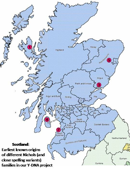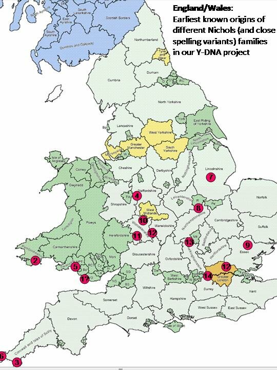 Click here for a Nichols (and close spelling variants) Y-DNA map of England/Wales or here for a Y-DNA map of Scotland. These maps are numbered based on distinct Y-DNA lines identified from the table shown below that are traced back to specific areas of England/Wales or Scotland. Although we’ve identified nearly 90 different Nichols (and close spelling variants) Y-DNA lines in our project, only 14 have proven descent from a specific area of England/Wales and 5 from Scotland. If you clearly trace your Nichols (or close spelling variant) line to an area not yet represented on these maps, please email me at [email protected]